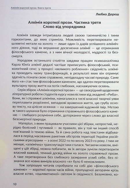 Вони,як і справжні алхіміки, намагалися в тиглі власної творчої уяви переплавити розрізнені, випадкові враження життя, цю грубу основу тексту, на цілісне осяяння —на завершений художній твір. Метою ж такого шукання було отримання справжнього філософського каменю — глибшого розуміння себе, доторкання через слово до власної безсмертної природи. Матеріал, з яким працювали учасники цієї збірки, непростий, нерідко болісний і чутливий — як правило, він у той чи інший спосіб пов?язаний із темою війни. Та й сама робота над текстами відбувалася період масованих ракетних обстрілів території України російськими агресорами — з осені 2022-го по весну 2023-го року. І тим не менше, «алхімічна» трансмутація таки сталася. Читаючи новели, вміщені у цій збірці, можна побачити, як їх автори зуміли перетворити власний важкий, темний досвід війни на золото справжньої прози. А таке перетворення без глибокого зазирання углиб себе, без пізнання все нових вимірів власного «я» було б неможливим.
