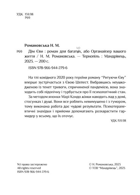 На тлі ковідного 2020 року героїня роману "Рятуючи Єву" вперше зустрічається з Євою Шелест. Вибравшись неушкодженою із тенет тривоги, спричиненої пандемією, вона знаходить собі підопічну і турбується про її психологічний стан.За методом японки Мері Кондо жінки наводять лад у домі, стосунках і душі. Вони все роблять неивмушено і з гумором, тому виконана робота дає чудові результати. Психотерапевтичні знахідки і прийоми допомагають розхарастити гармидер у всьому. що їх оточує.