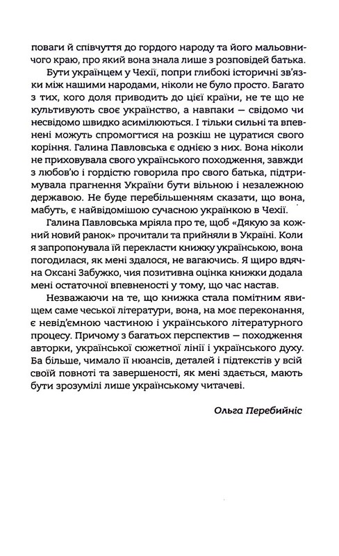 «Дякую за кожний новий ранок» — автобіографічний роман чеської письменниці українського походження Галини Павловської, який став однією з перших та водночас найпопулярніших її книжок. Дорослішання Ольги — alter ego самої авторки — відбувається на тлі драматичних подій 1968 року в Чехословаччині, окупації країни радянськими військами та наступних понад 20 років тоталітарного абсурду. Навіть із тавром племінниці «українського буржуазного націоналіста» дівчина намагається отримати від життя максимум. І хоча її родину важко назвати зразковою, безумовна любов і підтримка батьків стає для Ольги неоціненною на її шляху. Дружба, кохання, втрати, кумедні історії, неповторна Прага та перипетії, пов’язані з українською родиною головної героїні, переплітаються у захопливому сюжеті, сповненому дотепного гумору, витонченої іронії та несподіваних підтекстів.