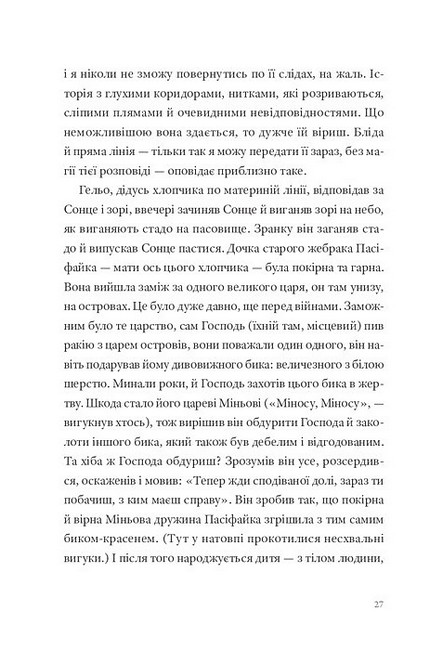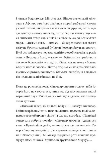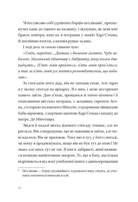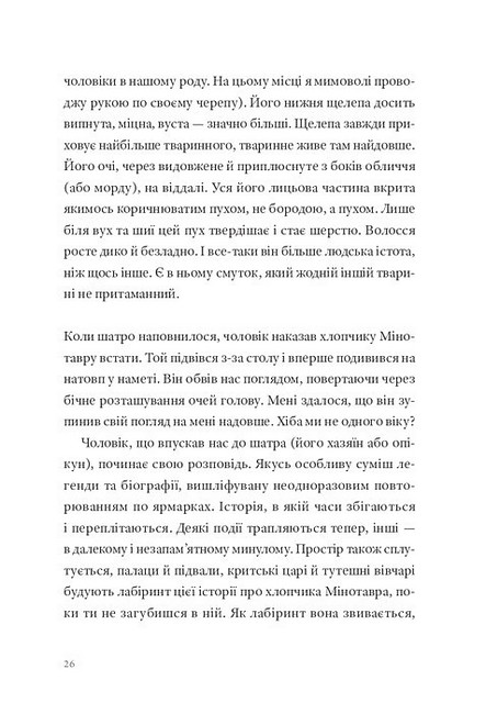 Цей ні на що не схожий роман є дослідженням лабіринту: місця, де ми блукаємо і знаходимо себе, місця, де натрапляємо на найнеймовірніші (і зовсім звичайні) історії, місця, де врешті-решт доходимо до Мінотавра — створіння, яке цілком може виявитися нами самими багато років тому. Мінотавром-дитиною, загубленим серед гамірливого ярмарку.