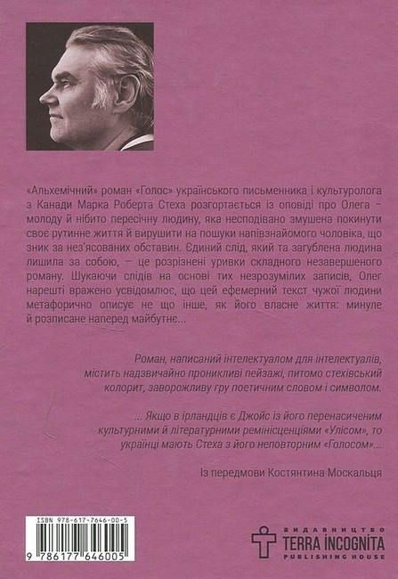 Альхемічний» роман «Голос» українського письменника і культуролога з Канади Марка Роберта Стеха розгортається із оповіді про Олега – молоду й нібито пересічну людину, яка несподівано змушена покинути своє рутинне життя й вирушити на пошуки напівзнайомого чоловіка, що зник за нез’ясованих обставин. Єдиний слід, який та загублена людина лишила за собою, — це розрізнені уривки складного незавершеного роману. Шукаючи слідів на основі тих незрозумілих записів, Олег нарешті вражено усвідомлює, що цей ефемерний текст чужої людини метафорично описує не що інше, як його власне життя: минуле й розписане наперед майбутнє...