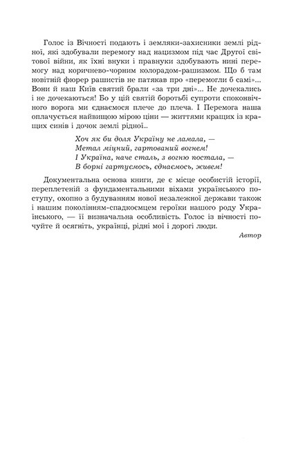 «Голос із вічності. Urbi et Orbi» — це книга, що звучить як заклик, як пам'ять і як нагадування про нескореність українського духу. Автор, Іван Чиж, розкриває складні й драматичні сторінки сучасної історії, з'єднуючи минуле з теперішнім. Текст наповнений символами боротьби та незламності, серед яких — метал «Азовсталі», віддзеркалений у Дніпрових водах, як знак нескінченності і прагнень українців до свободи.