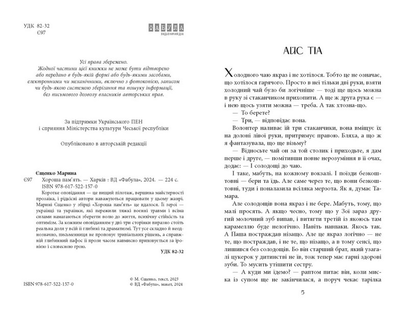 Коротке оповідання — це вищий пілотаж, вершина майстерності прозаїка, і рідкісні автори наважуються працювати у цьому жанрі. Марині Єщенко у збірці «Хороша пам'ять» це вдалося. Її герої — українці та українки, які пережили тяжкі воєнні травми і всіма силами намагаються зберегти волю до життя, психічну стійкість та оптимізм. За кожним оповіданням у дві-три сторінки виразно стоїть реальна доля у всій її глибині та драматизмі. Тут усе складно й неоднозначно, письменниця не пропонує тривіальних рішень, а справжній глибинний пафос її прози часом навмисно приховується за іронією і словесною грою.