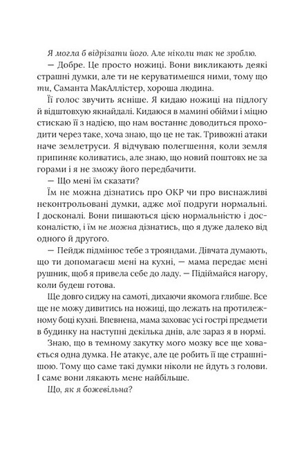 Саманта Макаллістер нічим не відрізняється від інших популярних дівчат її класу. Та під випрямленим волоссям і бездоганним макіяжем ховається таємниця, яку її друзі ніколи не зрозуміли б: у Сем «суто обсесивний» ОКР, і вона потопає у вирі темних думок і тривог, яких не може позбутися.
