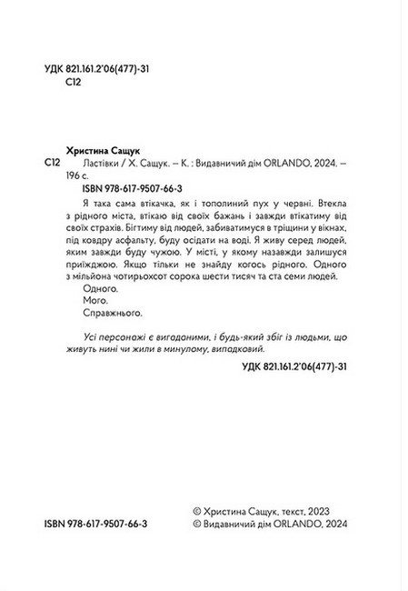 «Ластівки» Христини Сащук — це збірка, у якій поєднуються прозові мініатюри, поезія й філософські роздуми про життя. Авторка говорить просто про складне: про любов і втрати, про пошук власного голосу, про тишу, що народжується після бурі. У центрі книги — жінка, яка вчиться літати, навіть коли крила поранені.