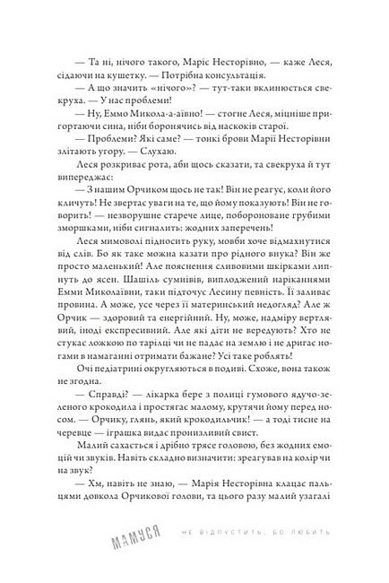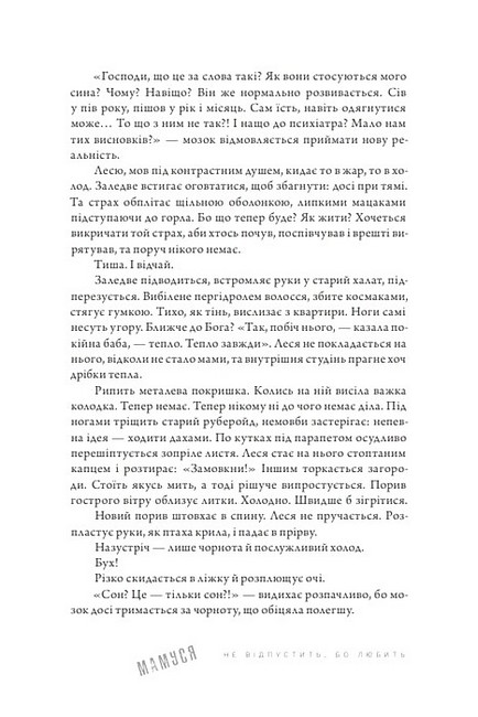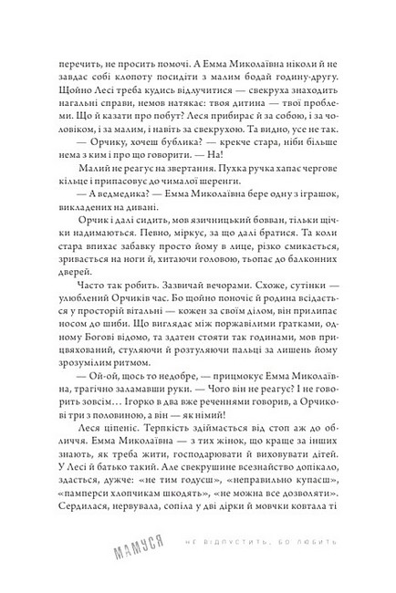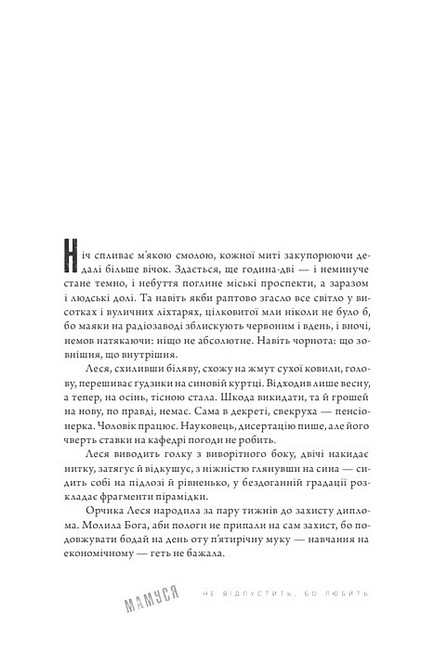 «Мамуся» — це книга, яка торкається серця з першої сторінки. Перед вами історія про родину, взаємини між поколіннями і тих маленьких, але важливих моментів, які роблять життя справжнім. Авторка майстерно показує, як любов, підтримка та розуміння можуть змінити людей, а також відкриває світ емоцій та переживань героїв у всій його глибині. Це історія про материнську ніжність, але водночас і про силу духу, яка надихає на власні кроки.