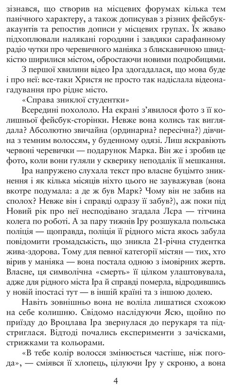 Місто, яке не відпускає. Кожен і кожна має свою причину любити чи ненавидіти його. Хтось хоче втекти звідси назавжди. А комусь цілком комфортно жити в невеликому містечку, середмістя якого займає величезний парк із невловимим черевичним маніяком, котрий вже став міською легендою.