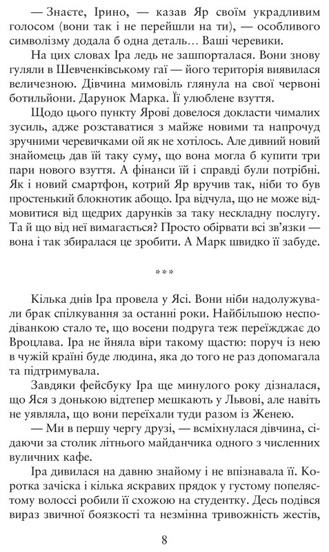 Це психологічний роман про сучасних українців та  українок, які закохуються, розстаються, дружать, шукають власне призначення в бентежному світі. Він про переживання травми та прийняття себе. А ще він про те, що світ тісний — і зв’язки людських доль плетуть дивне мереживо нашого плинного буття.
