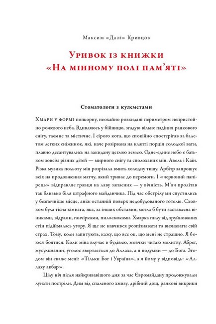 Ця книга — щоденник людини, яка пройшла війну, зберегла вірність слову і не зрадила правді. Максим «Далі» Кривцов залишив по собі тексти, що звучать як чесні свідчення очевидця, і водночас як глибока література. «На мінному полі пам’яті» — це відверта розмова про втрати, силу, гумор, дружбу та крихкість людського життя.
