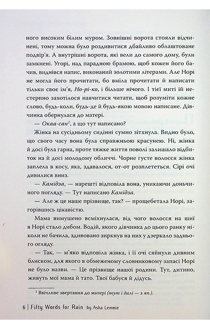 Норі — позашлюбна донька японської аристократки та темношкірого американського солдата. Її поява — ганьба для родини, яку неможливо визнати. Її замикають на горищі, змушують мовчати, соромитися і зникати з очей. Та коли до маєтку повертається зведений брат Акіра, життя Норі змінюється. Вперше хтось бачить у ній людину. Але цей крихкий зв’язок не до вподоби суворим традиціям. «П’ятдесят слів для дощу» — це історія про те, як важливо знайти свій голос, навіть якщо весь світ хоче тебе змусити мовчати.