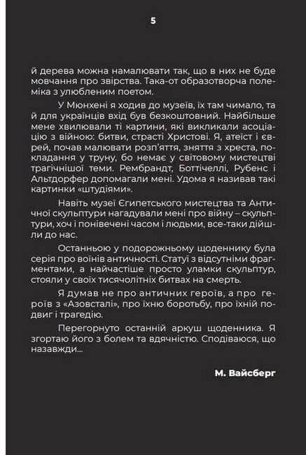 У кожної людини, яка пройде російсько-українську війну, залишаться свої спогади про її страшний колір: білий, як вмить посивіле волосся чи колір бинтів, червоний – колір крові і болю. Найстрашніший колір війни, у якому вороги спалили всі інші кольори й відтінки, – чорний, – колір згарищ, горя, жалобних стрічок на могильних вінках... На чорному папері створив графічну серію картин Матвій Вайсберг.