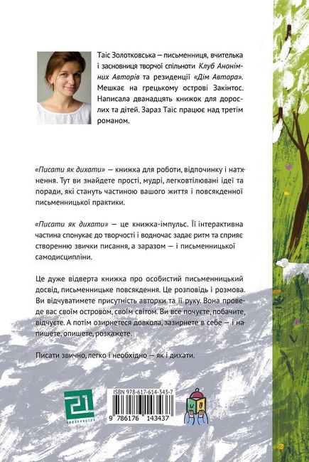 «Писати як дихати» — це книжка-імпульс. Її інтерактивна частина спонукає до творчості і водночас задає ритм та сприяє створенню звички писання, а заразом — і письменницької самодисципліни.