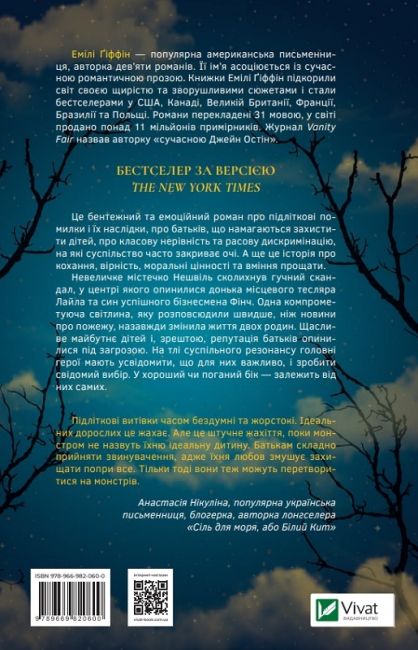 Це бентежний і емоційний роман про підліткові помилки і їхні наслідки, про батьків, які намагаються захистити дітей, про класову нерівність та расову дискримінацію, на які суспільство не повинно закривати очі. А ще це роман про кохання, вірність, моральні цінності та важливість вміти прощати рідних.