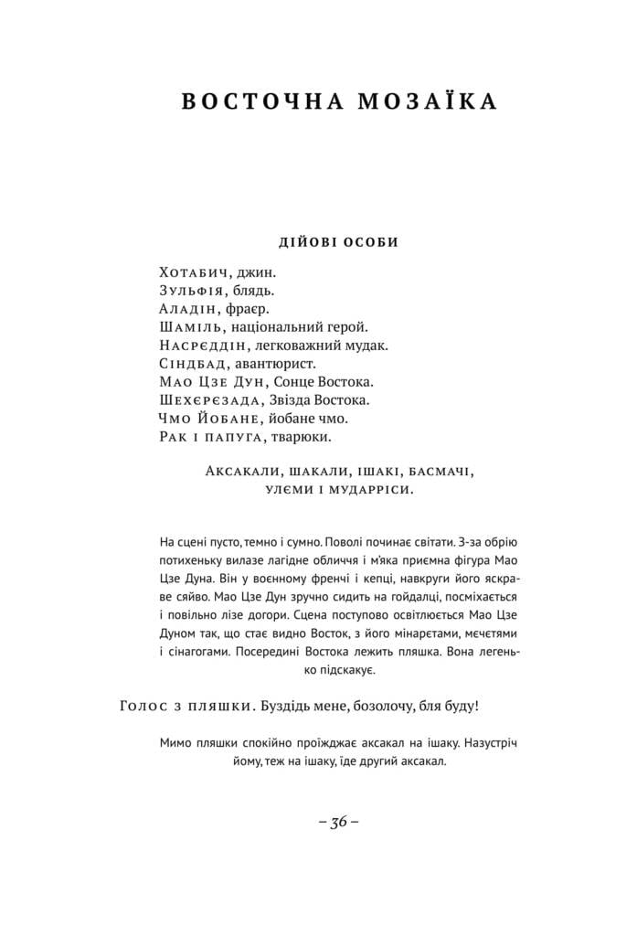 Када Лесь Подерв’янський переступав через бездиханне тіло великої Літератури, вона вдруг ожила; після того в них сталася преступна связь, і не одна. Про наслідки ніхто не думав. Герої і мутанти, історичні персонажі і класична нечисть, майстерні богошукачі й не менш пікантні бляді -над ними всіма ширяють ангели злословія, ковтають шпаги і безстижо блюють на солов’їв. Творчість Подерв’янського - се викоханий плід художньої поножовщини та халатної медицини. У його п’єсах підступний естетизм вискакує з кущів - пальто нарозхрист - і показує читачам геть усе: і Ніцше, і кацапів, і гімно.