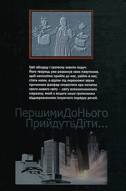 Журналіст, який зникає в нетрях передмістя; дівчинка Юта, яка блукає мертвим мегаполісом; роботяга велетенського міста-заводу та асоціальний тип Тарас, якого недолюблюють оточуючі й він їм платить взаємністю… Шляхи життя цих героїв сплітаються у тісний клубок – і ось уже розподілені ролі: де комусь належить бути маріонеткою, а хтось наважується стати поводирем-деміургом… «Першими до мене прийдуть діти» – зразок альтернативної прози, замішаної на абсурді, реалізмі, кіберпанку і ядучому сарказмові. Світ абсурду і гротеску зовсім поруч. Його творець уже розкинув своє павутиння, щоб непомітно прийти до нас, увійти в нас, стати нами, а відтак під переможні звуки причинних фанфар сповістити про початок свого нового світу – світу всеохоплюючого маразму, який є всього лише гротескним віддзеркаленням існуючого порядку речей.