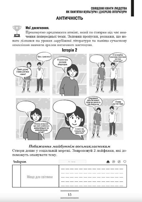 Родзинкою видання є наскрізна рубрика «Мої досягнення», де кожен зможе відзначити свої успіхи з предмета у вигляді коміксу. Посилання на цікаві статті, навчальні відео та ігри закодовано в QR-кодах в рубриці «Корисні матеріали», а у рубриці «Творча майстерня» учні спробують себе у різних ролях та навчаться створювати хмару слів, ментальну карту та стрічку часу. Зошит призначений для учнів 8 класу, та для полегшення роботи учителів зарубіжної літератури.