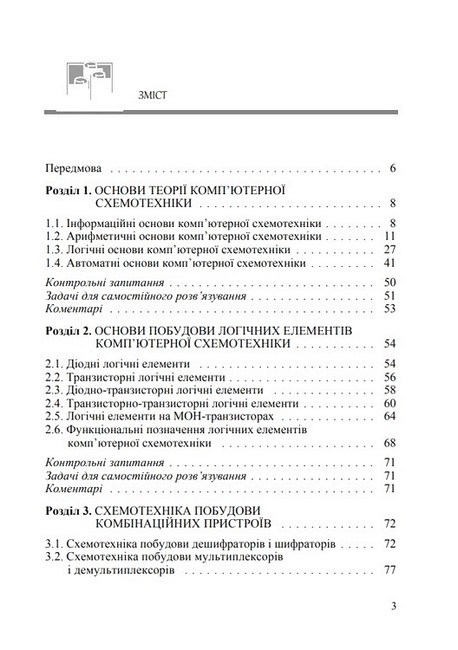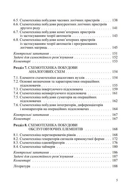 У навчальному посібнику викладено основні поняття комп'ютерної схемотехніки і методи побудови різноманітних комп'ютерних схем та схем автоматики і управління. Теоретичний матеріал проілюстровано великою кількістю вправ та задач для набуття читачем практичного досвіду. Навчальний посібник призначено для студентів, аспірантів і спеціалістів, які використовують відповідні математичні та комп'ютерні методи для побудови схем обчислювальної техніки і автоматики, а також окремі розділи посібника можуть бути використані студентами технічних навчальних закладів.