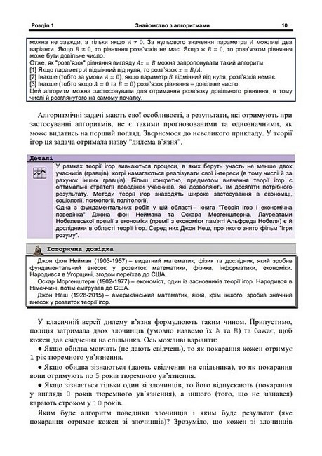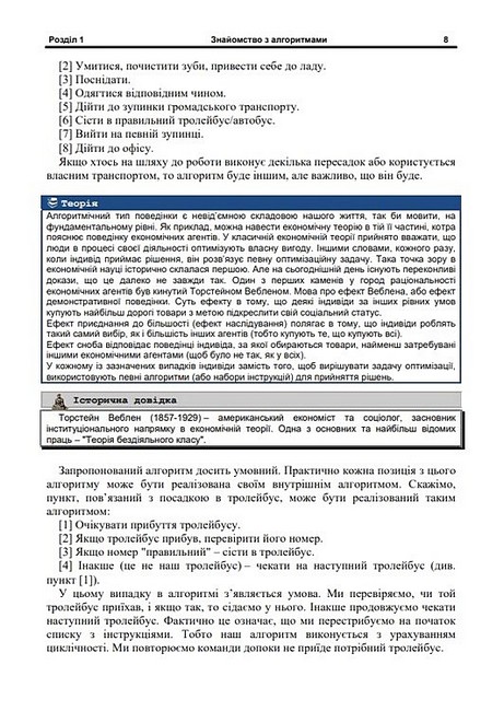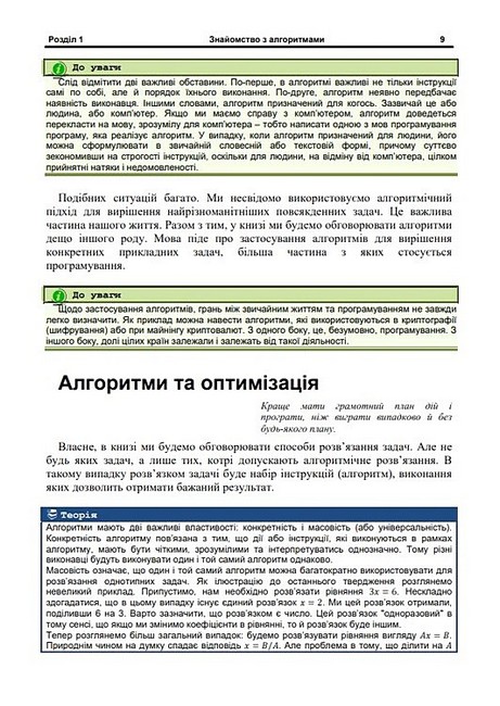 Посібник, який читач тримає в руках, присвячений алгоритмам. У ньому розглядається широке коло тем, так чи інакше пов’язаних з програмуванням і аналізом даних. Зокрема, розповідається, що таке алгоритми й навіщо вони потрібні, наводяться правила алгоритмічного псевдокоду, обговорюються підходи щодо аналізу складності алгоритмів. Крім цього, аналізуються такі типи даних, як масиви, списки, дерева та графи. Приділяється увага обчислювальним задачам. Окремі розділи книги присвячені нейронним мережам та квантовим обчисленням. Також книга містить додаток з прикладами програмних кодів мовою Python, в яких реалізуються алгоритми з книги.