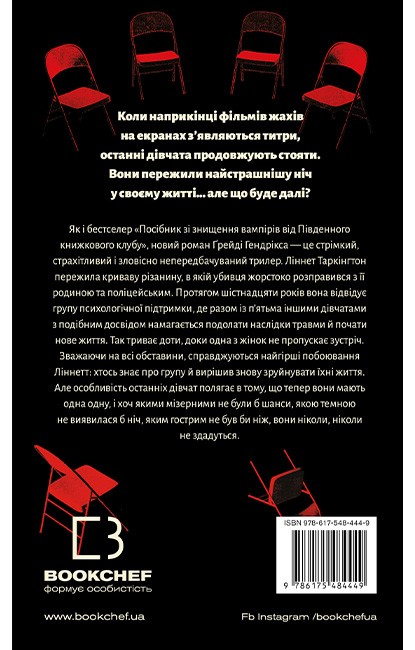 Уявіть собі: ви пережили жах, який міг стати фіналом будь-якого хорору. Ви — «остання дівчина», єдина, хто вижив після кривавої бійні. Та що робити далі? «Група підтримки останніх дівчат» — це вибуховий трилер від Грейді Гендрікса, де культові прийоми слешера перетворюються на психологічний роман про травму, виживання та помсту. Книга балансує між чорним гумором і холодним жахом, не відпускаючи до останньої сторінки.
