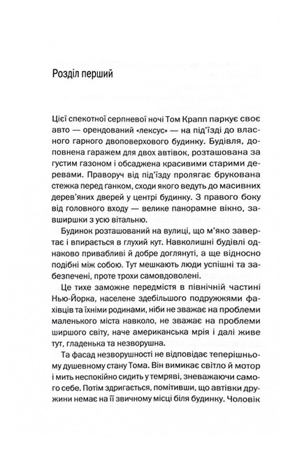 Напружений психологічний трилер від авторки світових бестселерів. Тиша затишного передмістя порушується жахливою новиною: у будинку трапилася подія, яка перевертає життя мешканців. Чи справді ми знаємо тих, хто живе поряд із нами? І що приховують навіть найближчі люди?