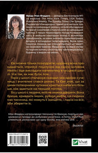 «Вчитель» — це психологічний трилер від авторки бестселерів The New York Times, який приковує увагу з перших сторінок і не відпускає до самого фіналу. Шкільні стіни приховують моторошні таємниці, здатні зруйнувати життя. Один неправильний крок — і правда стає смертельно небезпечною.