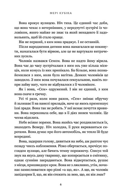 Мері Кубіка — авторка світових бестселерів New York Times. Вона вміє створювати багатошарові сюжети, у яких неможливо довіряти нікому. «Зникла жінка» змусить сумніватися в кожному персонажі й перегортати сторінку за сторінкою, поки не відкриється правда.