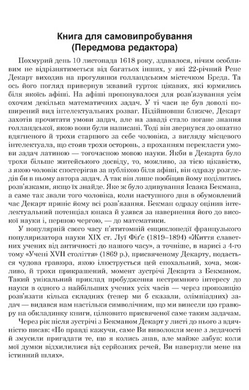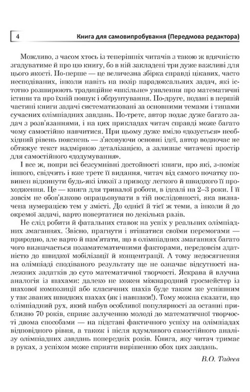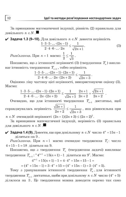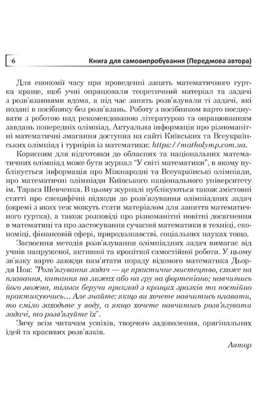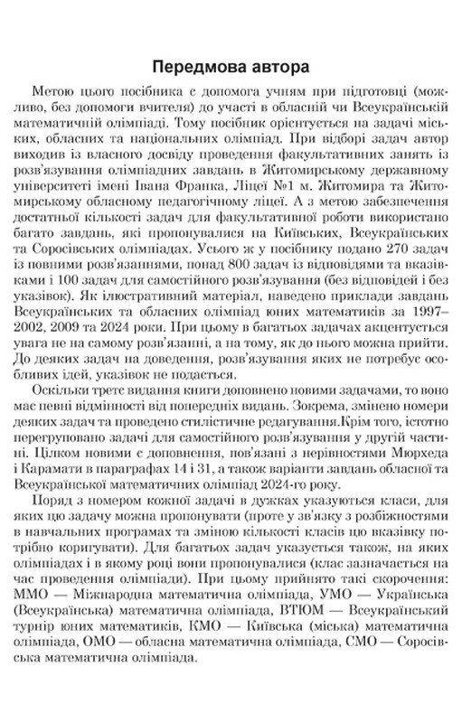 Посібник призначений для проведення факультативної роботи з математики і підготовки учнів до участі в математичних олімпіадах. У посібнику описані основні методи та ідеї для розв’язування олімпіадних задач, які недостатньо вивчаються у шкільному курсі математики. Кожен метод супроводжується теоретичним обґрунтуванням, прикладами розв’язаних задач та задачами для самостійного розв’язування. Всього запропоновано понад 1000 задач, з них 270 задач подано з розв’язаннями, а до інших даються відповіді або вказівки. Уміщено приклади завдань обласних та Всеукраїнських олімпіад юних математиків за 1997–2002, 2009 та 2024 роки. Для учнів старших класів, учителів, викладачів підготовчих курсів, керівників гуртків, студентів математичних спеціальностей вищих навчальних закладів.