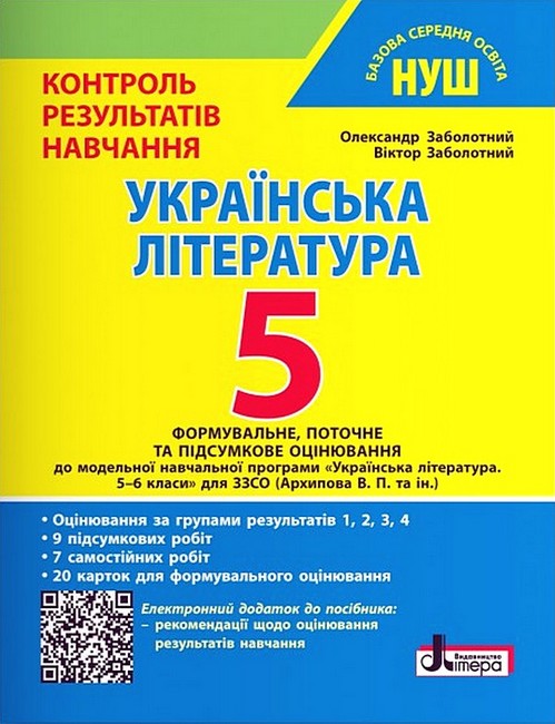Посібник призначено для формувального, поточного та підсумкового (тематичного, семестрового) оцінювання навчальних досягнень учнів / учениць 5 класу з української літератури. Зокрема, уміщено роботи, проведення яких передбачає використання тестових завдань. Ці завдання розроблено з урахуванням моделі зовнішнього незалежного оцінювання, пропонованої Українським центром оцінювання якості освіти, а також з урахуванням державних санітарних норм.