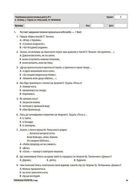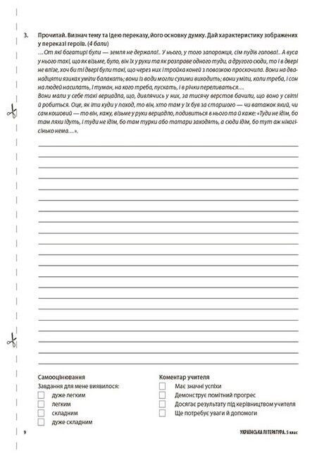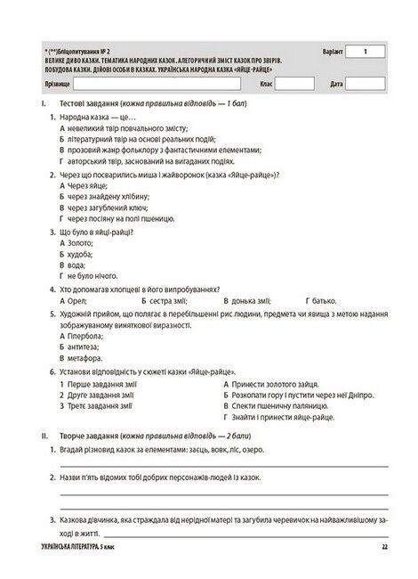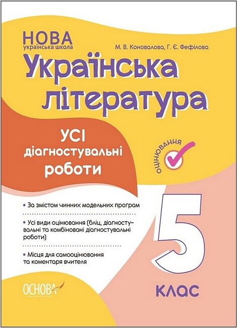 Посібник містить диференційовані, творчі завдання, діагностувальні роботи для учнів 5-го класу з усіх тем курсу української літератури, що відповідає основним чинним програмам, рекомендованим Міністерством освіти і науки України (наказ Міністерства освіти і науки України від 12.07.2021 № 795). Завдання дібрано для всіх видів оцінювання, зокрема: бліцопитування (теоретичний матеріал і матеріали на знання тексту); поточні діагностувальні роботи; комбіновані діагностувальні роботи (тестування, різнорівневі практичні завдання). Роботи розміщено на окремих аркушах (за варіантами), наприкінці яких відведено місце для самооцінювання здобувачів освіти й коментаря вчителя.