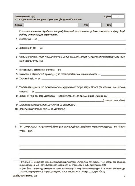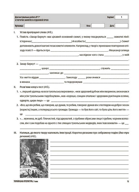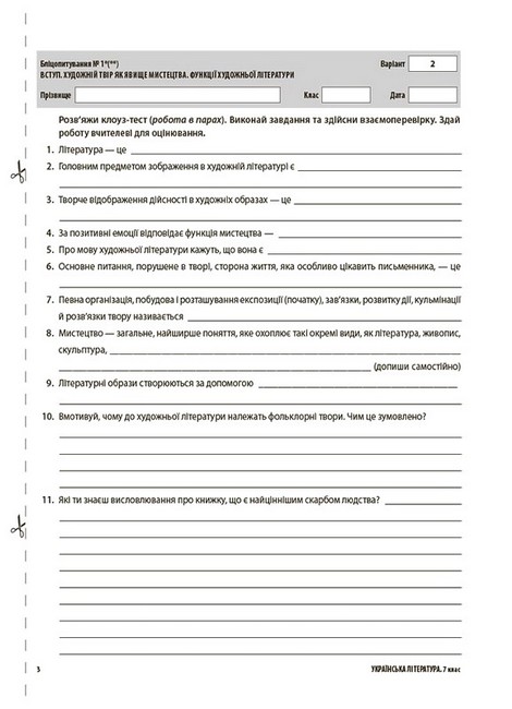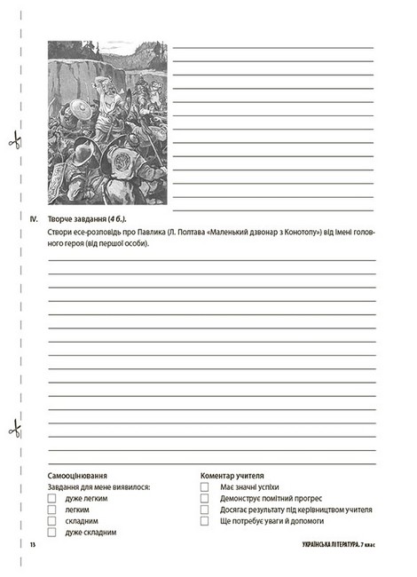 У посібнику, що має зручну форму зошита, наведено завдання для всіх видів оцінювання із зарубіжної літератури за 7-й клас, зокрема: