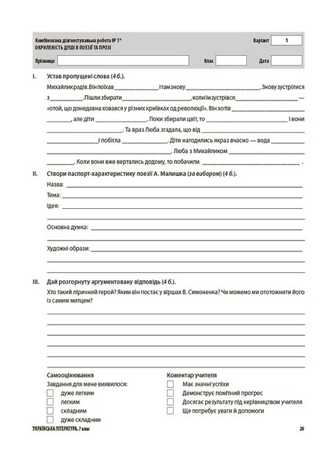 Усі роботи розміщені на окремих аркушах (за варіантами), наприкінці яких відведено місце для самооцінювання здобувачів освіти та коментаря вчителя.