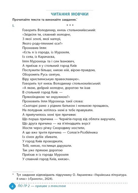 Посібник укладено відповідно до чинної модельної програми з української літератури (автори: Т. Яценко, В. Пахаренко, С. Шило, О. Слижук та ін.) з урахуванням вимог Державного стандарту освіти — оцінювання за чотирма групами результатів. Видання містить різноманітні завдання з української літератури різного рівня складності. Посібник призначено для якісного ви- мірювання рівня навчальних досягнень учнів 8 класу. У зошиті представлено по дві роботи для поточного оцінювання (ПО) та по одній підсумковій роботі (ПР) для всіх чотирьох груп резуль- татів у кожному семестрі (згідно з вимогами МОН України — лист «Про окремі питання оцінювання результатів навчання» від 14.03.2025 за № 1/4895–25). Для учнів, учителів і батьків.