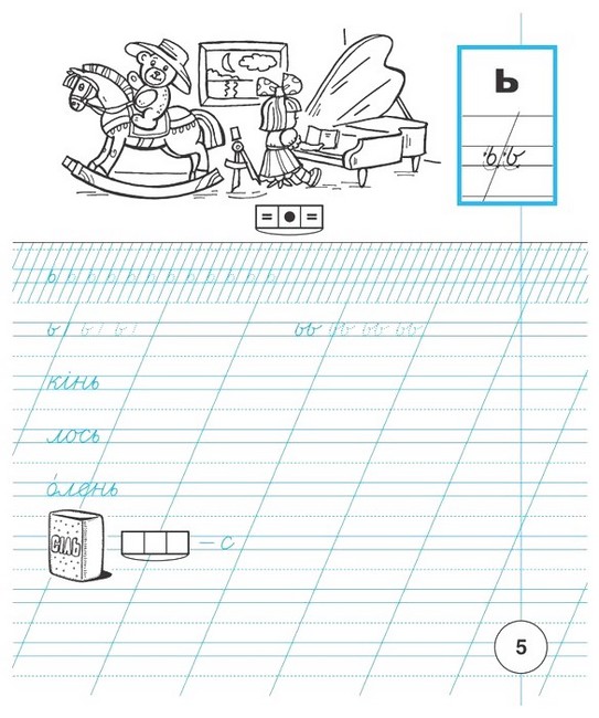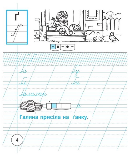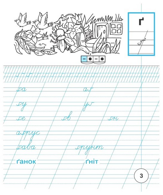 У зошиті подано зразки написання рядкових і великих літер української абетки, що відповідають «Єдиним зразкам каліграфічного письма букв та їх з’єднань», затвердженим МОН України. Запропоновано шаблон (похилі лінії, розміщені на відстані ширини рядкової літери), виділено нижню рядкову лінію, наведено елементи кожної літери та послідовність її накреслення. Для закріплення навичок каліграфічного письма подано різні варіанти з’єднань уже вивчених букв, зразки написання окремих слів, а також короткі речення (друкованим шрифтом) для списування, вставка з калькою. Цікавим нововведенням є кольорова вкладка. Дитина має можливість знайти наклейку-ілюстрацію до запропонованої звукової моделі і наклеїти зображений фрагмент сюжетного малюнка у потрібному місці. Зошит відповідає Державному стандарту початкової освіти, типовим освітнім програмам МОН України та підручнику «Українська мова. Буквар. 1 клас» (авт. М.С. Вашуленко, О.В. Вашуленко).