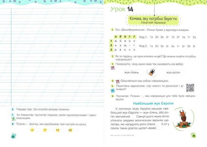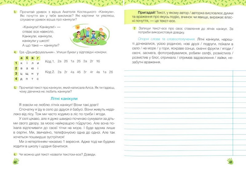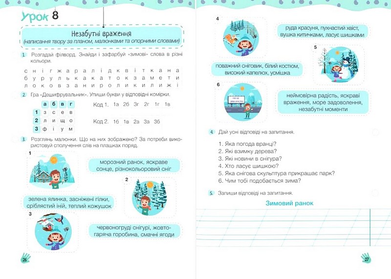 Зошит містить практичний матеріал, який відображає змістові лінії Державного стандарту початкової освіти «Взаємодіємо письмово» та «Взаємодіємо усно», спрямовані на формування в другокласників умінь висловлювати свої думки, почуття в письмовій формі, у різних видах мовленнєво-творчої діяльності, а також сприймати, аналізувати й оцінювати інформацію, спілкуватися усно з однолітками.