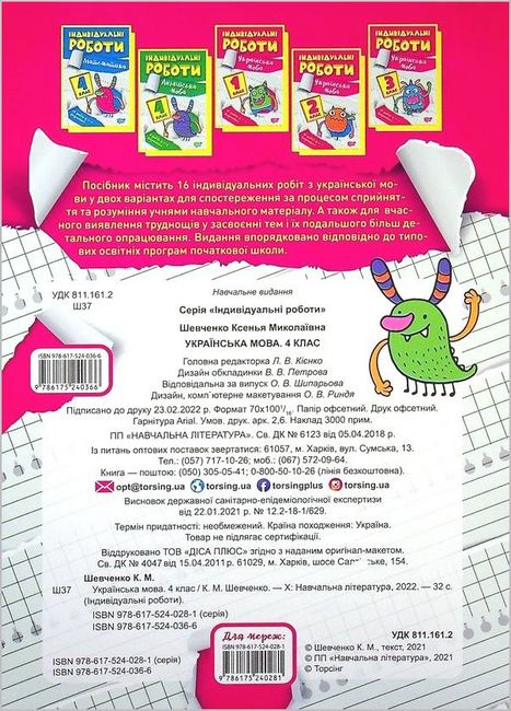 Книга містить 16 індивідульних робіт з української мови у двох варіантах для спостереження за процесом сприйняття та розуміння учнями навчальному матеріалу. А також для вчасного виявлення труднощів у засвоєнні тем і іх подальшого більш детального опрацювання. Видання впорядковано відповідно до програми Нової Української Школи для учнів початкової школи.