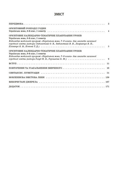 Пропонований посібник має на меті допомогти вчителям-філологам, які з 2025–2026 навчального року впроваджуватимуть модель НУШ у 8-му класі. Авторка посібника пропонує вчителям орієнтовний розподіл годин за програмами. З огляду на те, що в одній з модельних програм немає чіткого розподілу годин за темами, а в другій розділено мовну й мовленнєву змістові лінії (що спричиняє труднощі в плануванні уроків), пропоновані таблиці — це суто авторське сприйняття програм. Учителі зможуть, спираючись на цей матеріал, самостійно вдосконалити його та скласти календарно-тематичне планування, зважаючи на рівень навчальних досягнень певного класу та власні вподобання.