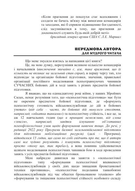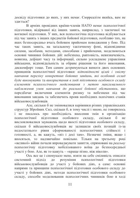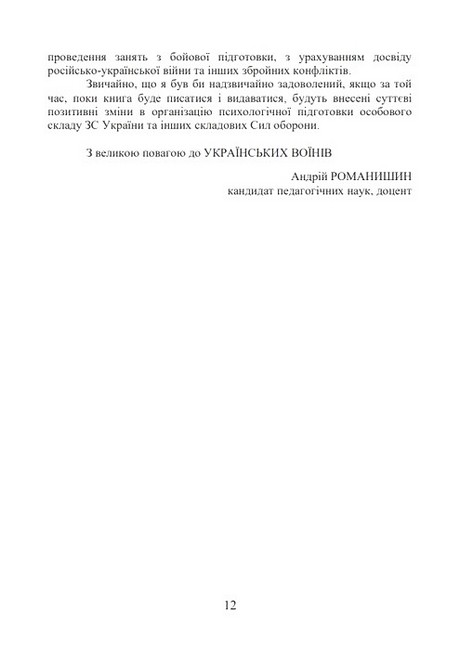 У книзі розглядається системний підхід до розуміння сутності психологічної підготовки військовослужбовців до участі у бойових діях. Його матеріали дозволять командирам (начальникам), які прагнуть отримати ґрунтовні знання з організації психологічної підготовки, а саме: щодо основних напрямів та принципів психологічної підготовки особового складу до участі у бойових діях, методів психологічної підготовки особового складу, способів моделювання психологічних чинників бою в ході проведення занять з бойової підготовки, та методично грамотно і правильно психологічно загартовувати підлеглий особовий склад. Книга призначена для командирів (начальників) усіх рівнів, науково-педагогічних працівників та курсантів ВВНЗ.