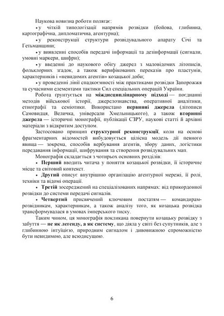До уваги читачів пропонується книга, присвячена військовому мистецтву українського козацтва з використанням розвідувальної і контррозвідувальної роботи. Розкриваються особливості агентурної діяльності, спеціалізовані напрями козацької розвідки, а також діяльність командирів-розвідників та їхні спецоперації. Проведено аналіз сутності та зміст військових хитрощів і показано взаємозв’язок розвідки, контррозвідки з проведенням вигідного інформаційно-психологічного впливу українських козаків. Рекомендовано для проведення науково-дослідної діяльності студентами,