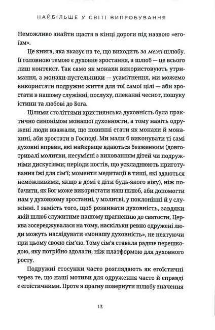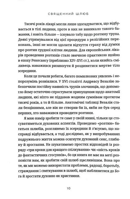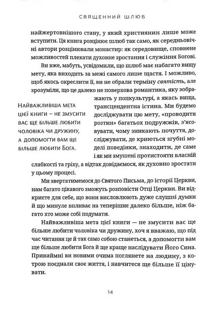 Шлюб — це більше, ніж пошук щастя. Це шлях до зростання, де ми вчимося прощати, любити без умов і ставати кращими. Назва книги "Священний шлюб. А що, як Бог задумав подружжя не лише, щоб ми були щасливими, а й святими?" пропонує переосмислити значення шлюбу. Можливо, головне його призначення — це не комфорт, а глибоке внутрішнє перетворення і духовний розвиток?