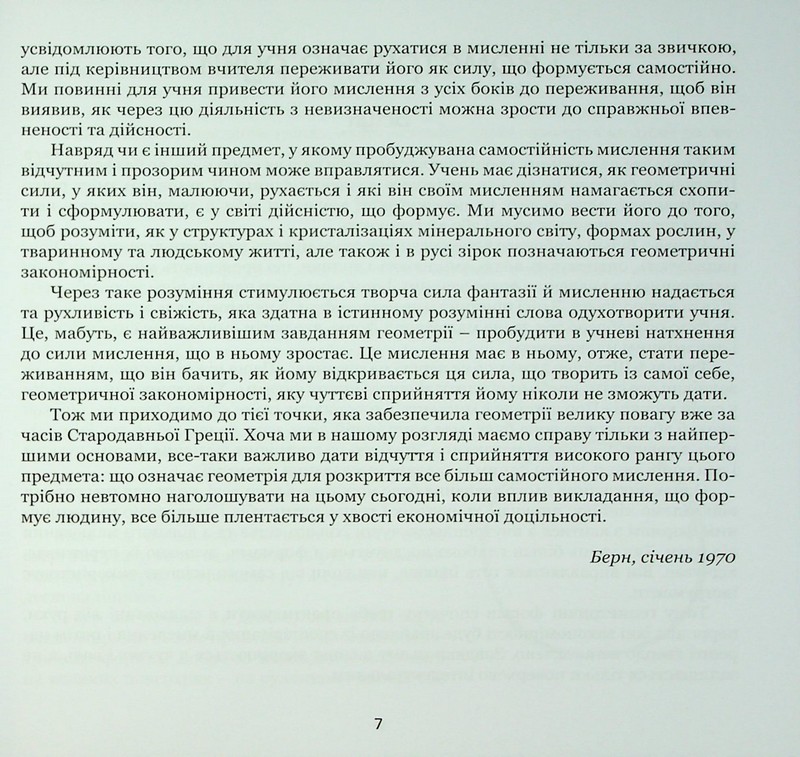 Арнольд Віс і Ернст Бюлер пропонують унікальний погляд на геометрію як на процес мислення, а не набір формул. Автори показують, як через роботу з просторовими уявленнями можна розвивати внутрішню активність, уяву та інтелектуальну свободу. Книга читається повільно, з олівцем у руці, і щоразу відкриває нові рівні розуміння.