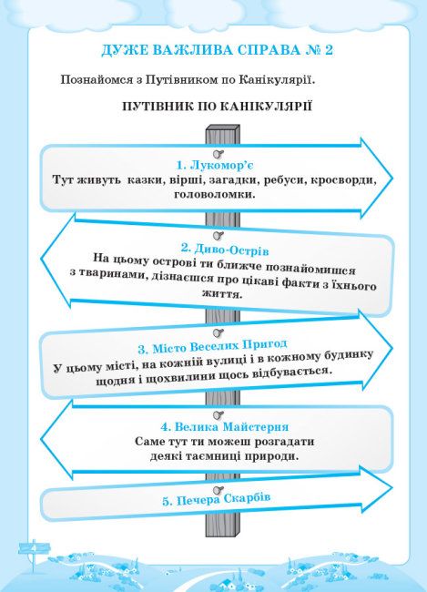 «Подорож країною Канікулярія» — це зошит, який дозволяє організувати роботу учнів 2-го класу на канікулах. Мандруюючи Канікулярією, учні в ігровій формі закріплюють отримані знання, розв’язують кросворди, загадки, головоломки, вдосконалюють набуті навички, розвивають мислення, уяву, пам"ять, мовлення, дрібну моторику. Подорож буде не тільки захопливою, але й корисною. Завдання в зошиті дібрані з урахуванням програмного матеріалу і вікових особливостей учнів.