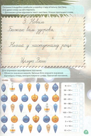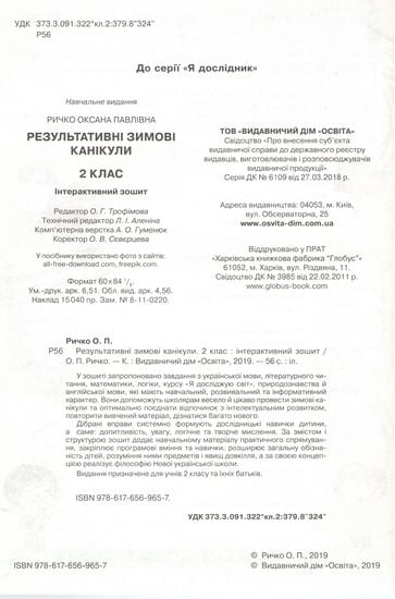 У зошиті запропоновано завдання з української мови, літературного чи тання, математики, логіки, курсу «Я досліджую світ», природознавства й англійської мови, які мають навчальний, розвивальний та інформативний характер. Вони допоможуть школярам весело й цікаво провести зимові ка нікули та оптимально поєднати відпочинок з інтелектуальним розвитком, повторити вивчений матеріал, дізнатися багато нового. Дібрані вправи системно формують дослідницькі навички дитини, а саме: допитливість, увагу, логічне та творче мислення. За змістом і структурою зошит додає навчальному матеріалу практичного спрямуван ня, закріплює програмові вміння та навички, розширює загальну обізна ність дітей, розуміння ними предметів і явищ довкілля, а за своєю концеп цією реалізує філософію Нової української школи. Видання призначене для учнів 2 класу та їхніх батьків.