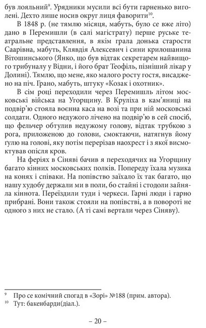 Ця книга містить незавершені спогади Анатоля Вахнянина – видатного галицького політика другої половини XIX cт., депутата Віденського рейхсрату і Галицького сойму, композитора, письменника, історика, першого голови товариства «Просвіта», організатора співацьких товариств, директора Музичного Інституту імені Лисенка. Спомини висвітлюють навчання автора у школах Перемишля, руській духовній семінарії у Львові, віденському університеті, розповідають про початки народовського українського руху в Галичині у 1860-і роки. Збірник доповнений спогадом отця Клима Вахнянина про життя семінаристів і духовенства в часи М.Шашкевича, а також згадкою про професора Івана Вахнянина. Книга розрахована на широке коло читачів, насамперед тих, хто цікавиться історією Галичини.